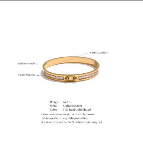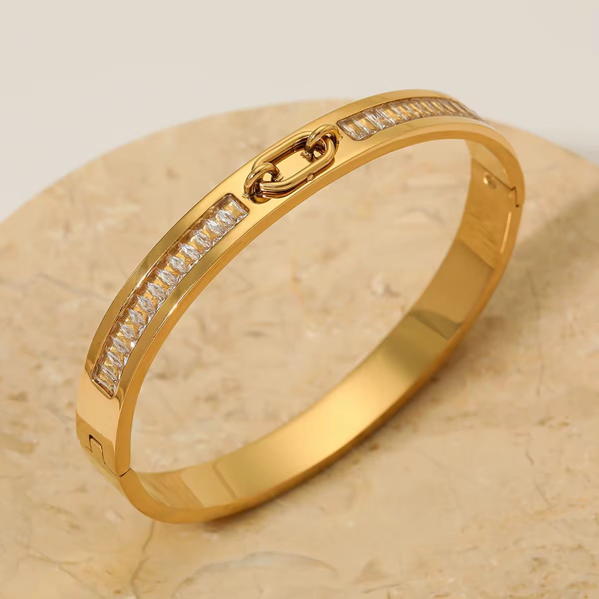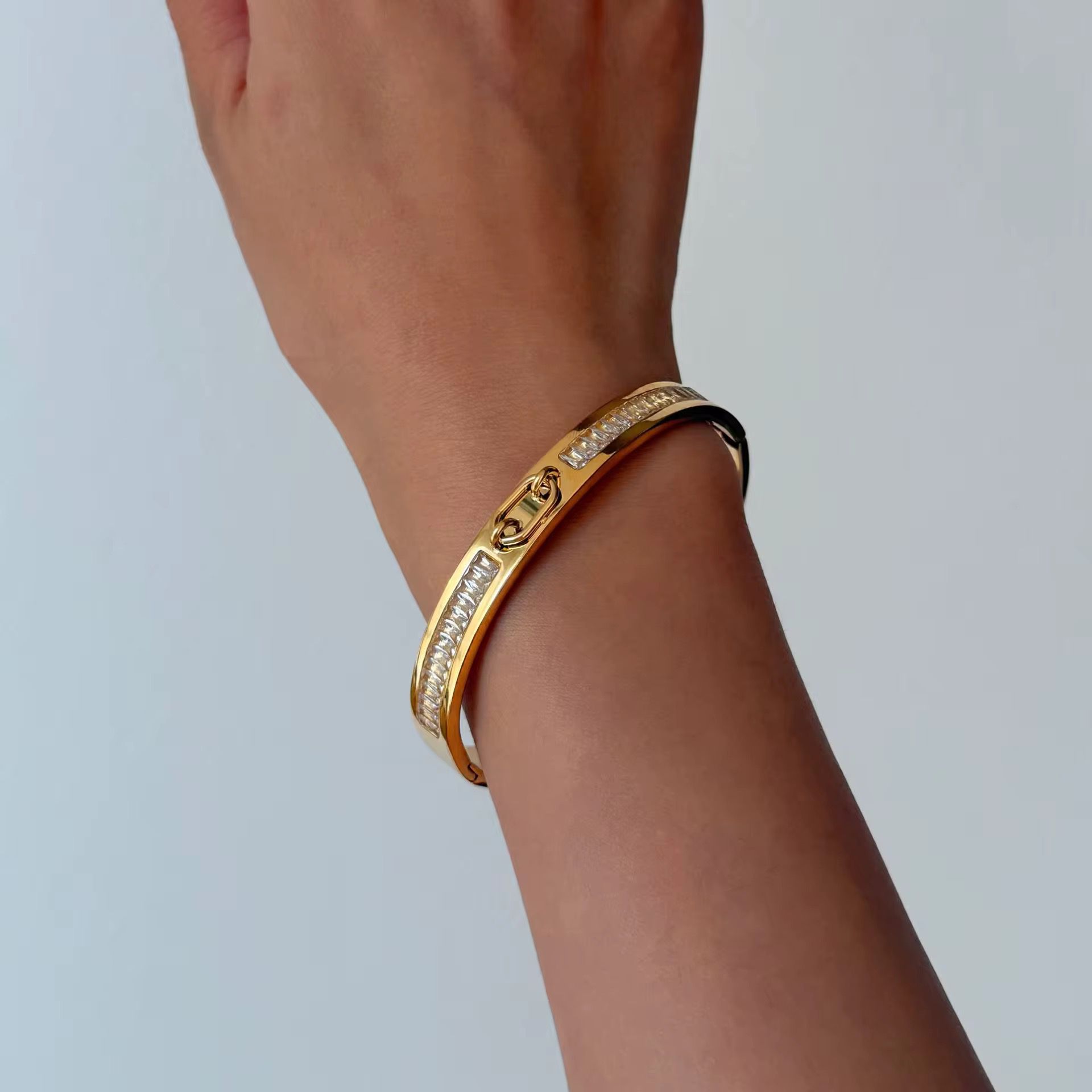 A timeless piece of elegance. The Eterna Bangle combines the strength of high-grade 316L stainless steel with the sophisticated sparkle of baguette-cut cubic zirconia, finished in a luxurious 18K real gold PVD plating.